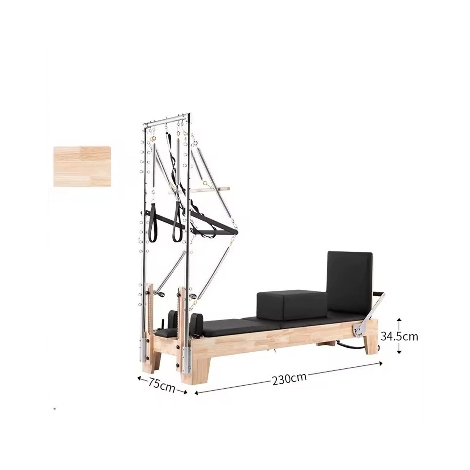 La combinazione Reformer + Half Tower consente di eseguire un’ampia gamma di esercizi: footwork, leg circles, arm series, roll down, chest expansion e short spine. Coinvolge in modo sinergico addominali, dorsali, glutei, arti superiori e inferiori. Ideale per allenamenti di resistenza, stretching e controllo motorio.